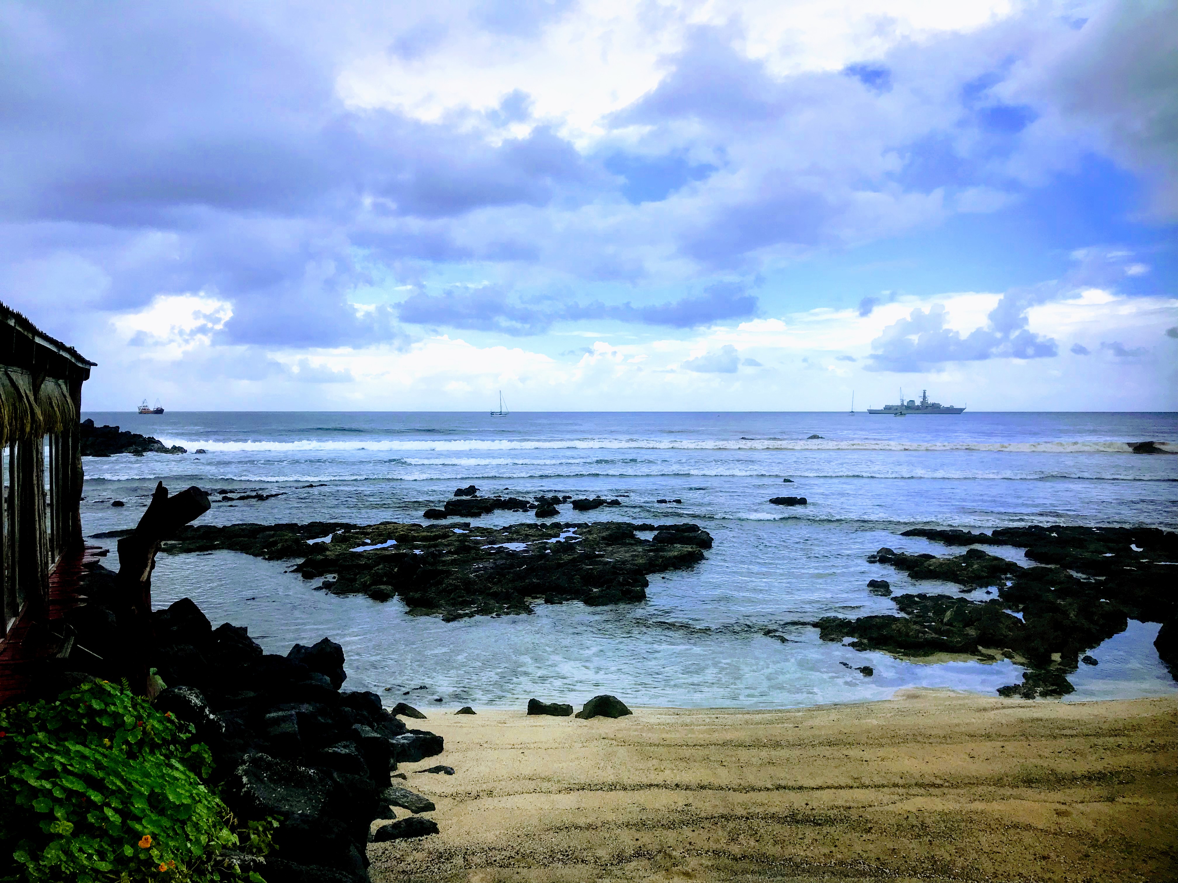 En el aeropuerto nos debía recoger alguien de la agencia con la cual habíamos contratado las visitas guiadas para tres de los seis días que permaneceremos en la isla. El chofer-guía-emprendedor del mini bus, Fernando Icka, quien además llevaría a sus hoteles a otros quince turistas, pacientemente nos hizo esperar hasta que se completó el número de pasajeros. Mientras esperábamos, comenzó a llover. Al llegar al mini bus, estalló el cielo y se dejó caer un aguacero impresionante. Todos a refugiarse al mini bus que no tenía maletero, mientras unas treinta maletas a plena intemperie se mojaban por completo. “Ya viene el camión, el que se lleva las maletas…está en camino”. Pasaron 3-4 minutos de lluvia torrencial, mientras algunos pasajeros salían como héroes a rescatar algunos maletines de género. Otros, sólo miraban desconsolados sus grandes maletas de género, imaginándose lo peor. Llegó el camión y lo cargaron raudamente.