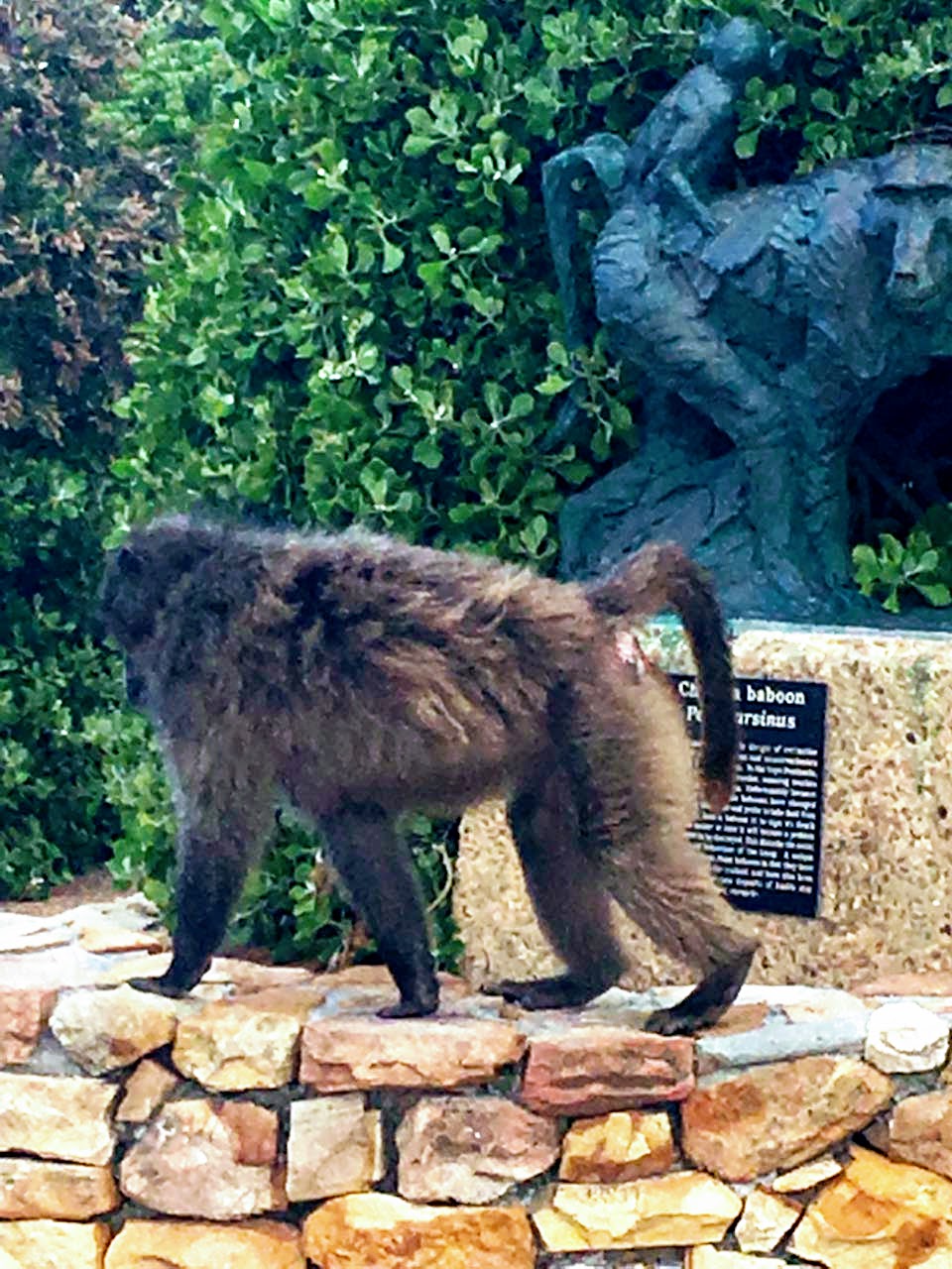 riachuelo que cruzábamos por un puente de madera rústico. Se trataba de una serpiente que había atrapado un sapo, en realidad uno no tan pequeño, de unos 10-12 cm de largo. Espero que mi foto de celular sea elocuente…(usen su imaginación, gracias). Después de ello, congregación de primates alrededor del foco de alarma. Fue muy entretenido. Un poco más allá, a cruzar el puente colgante más largo de Sudáfrica, 128 metros de largo, que no deja de ser, cruzando un barranco de unos 50 m de altura entre copas de árboles. Aquí también pude constatar, que en toda Sudáfrica los babuinos son un tema, un problema. Ver cartel del WC.